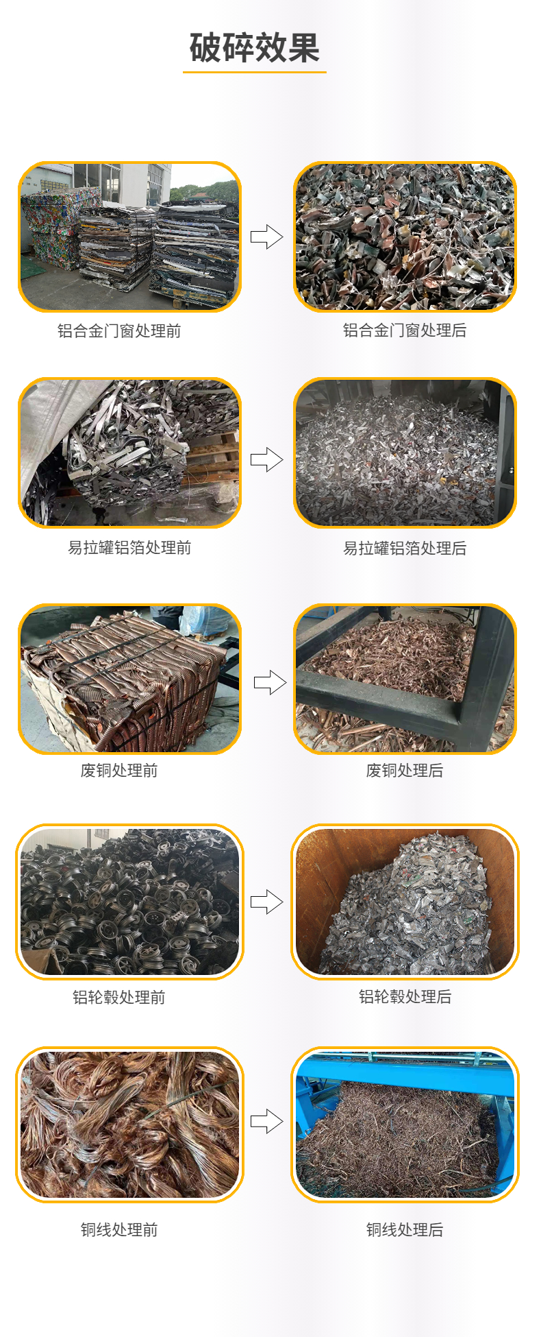 本機采用行星齒輪減速機驅(qū)動,刀片采用高強度合金鋼制成,有較強的耐磨性和較高的強度等特點,軸之間差速運轉(zhuǎn),有撕扯、擠壓、咬合等功能。電氣部分采用西門子電氣元件編程控制,具有自動檢測過載保護等功能。專為破碎各種鋁型材及輕薄金屬物料設(shè)計,適合各種大體積,難破碎的壓塊的或散件的鋁型材物料細化,具有出料均勻、大小可控等優(yōu)點,適合撕碎的物料有:打包鋁、鋁泊、鋁材、鋁條、輕薄鋼料、輕薄鐵料等各種廢金屬物料。效率高、低轉(zhuǎn)速、大轉(zhuǎn)矩、低噪音