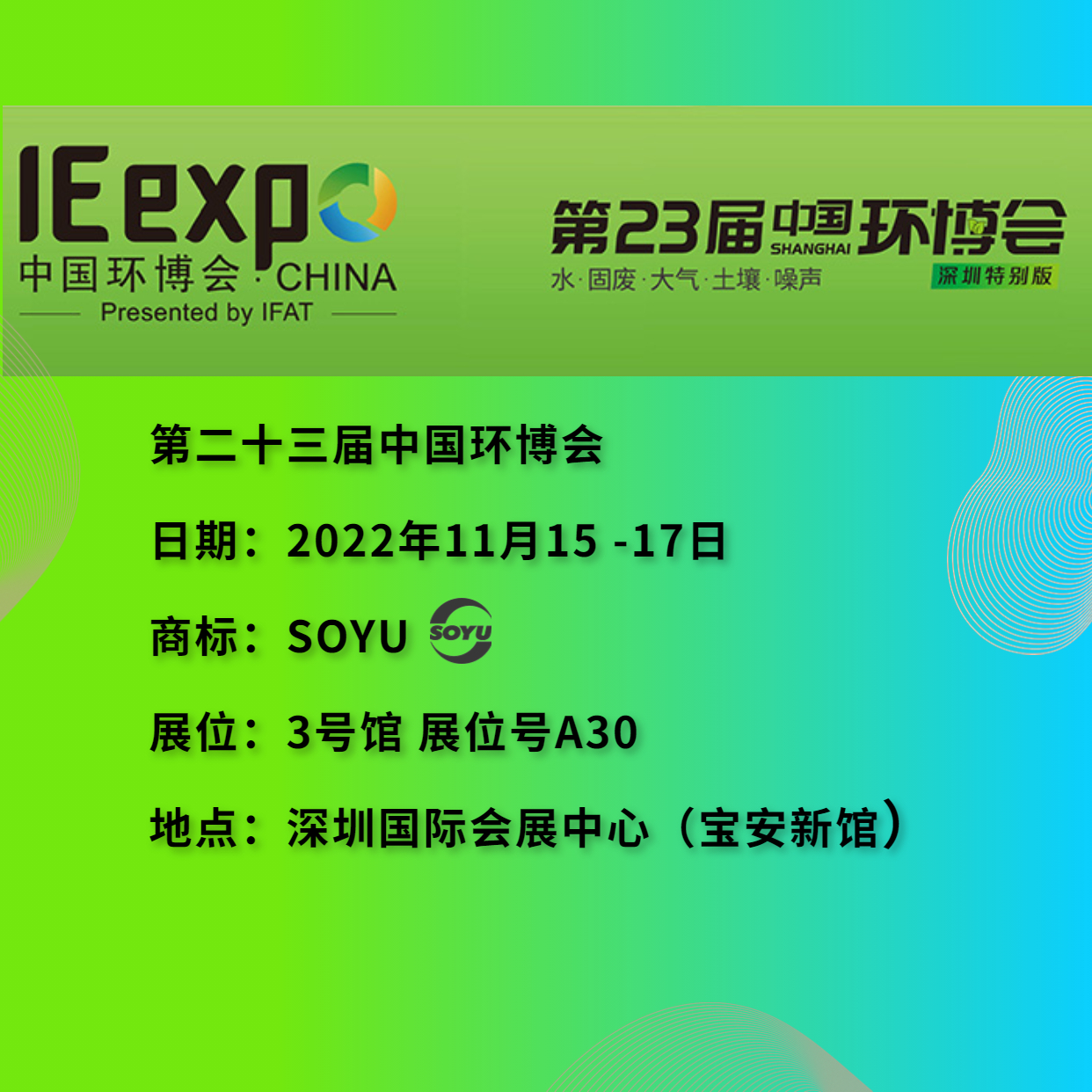 IE expo China 2022 第二十三屆中國環(huán)博會 日期:2022年11月15 – 17日 參展單位:首譽(常熟)機械有限公司 商標:SOYU 展位:3號館 展位號A30 地點:深圳國際會展中心(寶安新館)