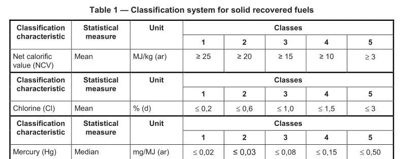 歐洲標(biāo)準BS EN 15359-2011,它對SRF燃料進行5個等級的質(zhì)量分類。里面的SRF燃料指的是solid recovered fuels,也就是沒有毒性的固體回收燃料,包括城市固體廢物、一般工業(yè)固廢、污水污泥等,包含的組分有木材、紙張、織物、塑料、橡膠等等。