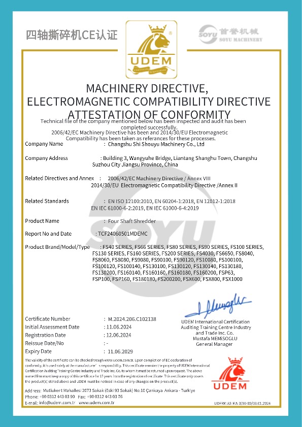其推出的單軸撕碎機(jī)、雙軸撕碎機(jī)與四軸撕碎機(jī),依托歐洲成熟技術(shù)內(nèi)核與嚴(yán)苛品質(zhì)管控,順利通過CE認(rèn)證,完全接軌國際安全與質(zhì)量標(biāo)準(zhǔn),為全球客戶提供合規(guī)可靠的破碎解決方案。